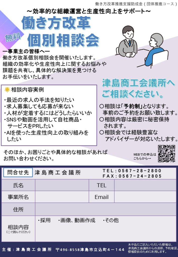 津島商工会議所では、無料で働き方改革の個別相談会を実施しております。