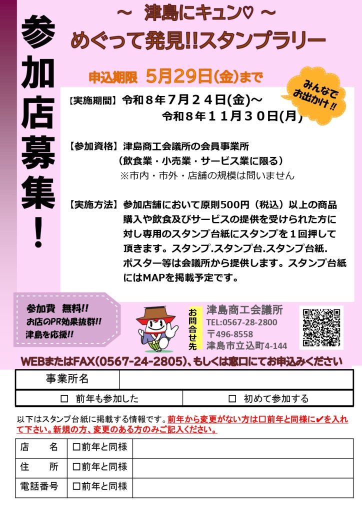 【会員限定】~津島にキュン♡~めぐって発見‼スタンプラリー参加店募集のお知らせ