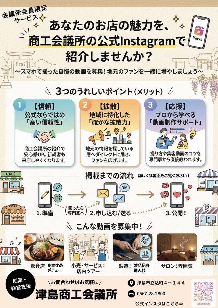 津島商工会議所では、公式Instagramのリール動画を活用して、会員企業の皆様の魅力を発信する新サービスを実施しています 。
