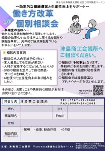 津島商工会議所では、無料で働き方改革の個別相談会を実施しております。 求人でお悩みの方やSNS等活用を検討の方はご相談ください! ★過去事例の紹介 ①急な採用が必要になったが、ハローワ―クだけではなく、ウェブでの求人募集 […]