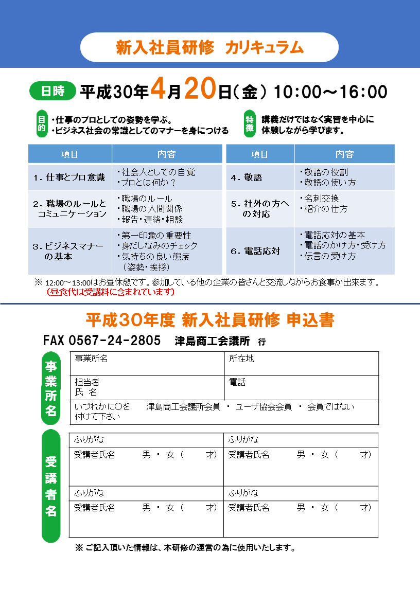 津島商工会議所では、新入社員・第二新卒・中途社員などの若手社員を対象にした、『新入社員研修』を開催します。