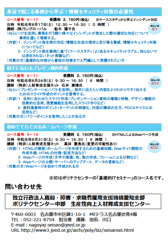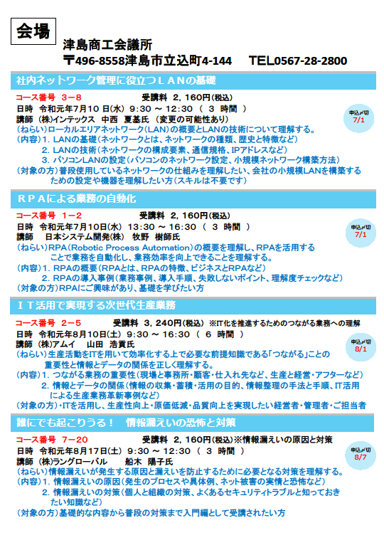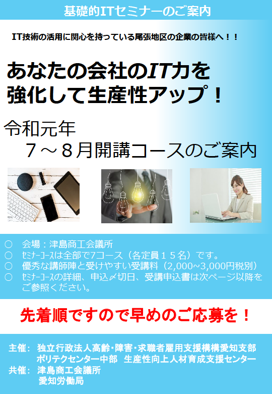 基礎的ITセミナーのご案内 2019年6月19日 最終更新日時 : 2024年3月23日 津島商工会議所 FacebookXBlueskyHatenaCopy 詳細はこちら http://www3.jeed.or.jp/aichi/poly/biz/seisansei.html